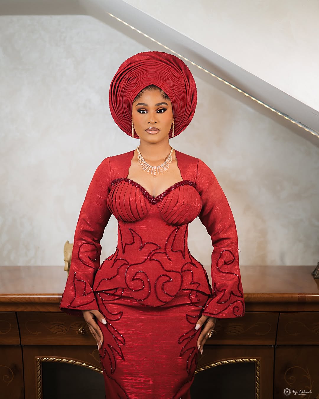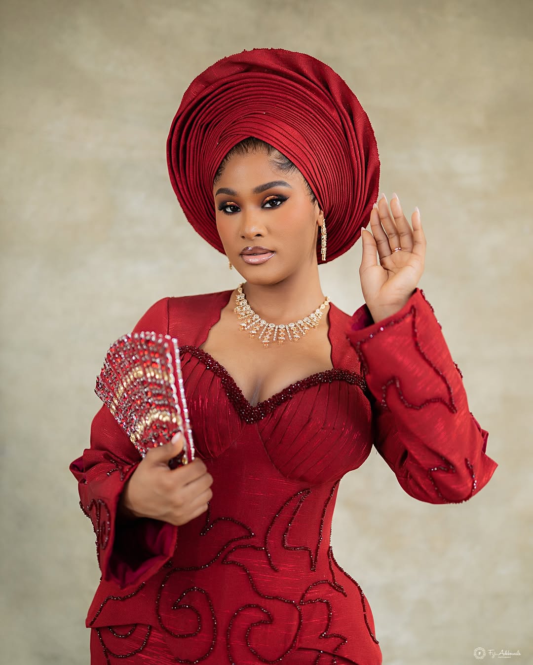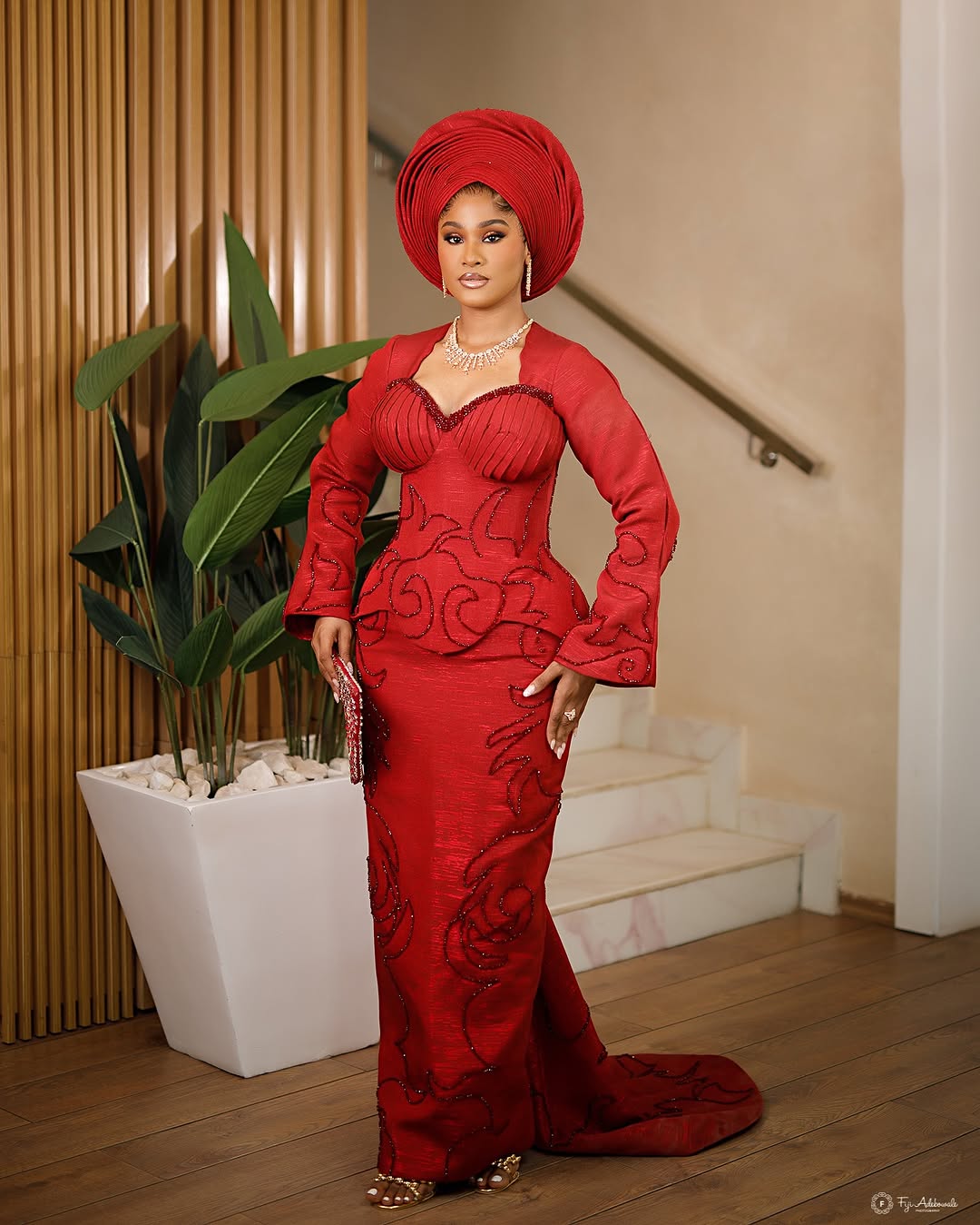 1106 Bridal designed this gorgeous red aso-oke bridal look, and it’s completely spectacular. From the beaded sweetheart neckline to the cutout patterns on the sleeves, the pleated bust and the swirly beadings all over the silhouette, this look is a perfect ten. A Yoruba bride absolutely needs her gele, and T Best Gele did not disappoint, crafting a perfectly upright gele with a regal touch. Beauty by OJZ then snapped with this glowy makeup, featuring smoky eyes and a glamorous finish. If you ask us, this ensemble is guaranteed to turn your wedding moments into a high-end fashion show. This is your cue to let this look help you bring out that stylish omóge in you.