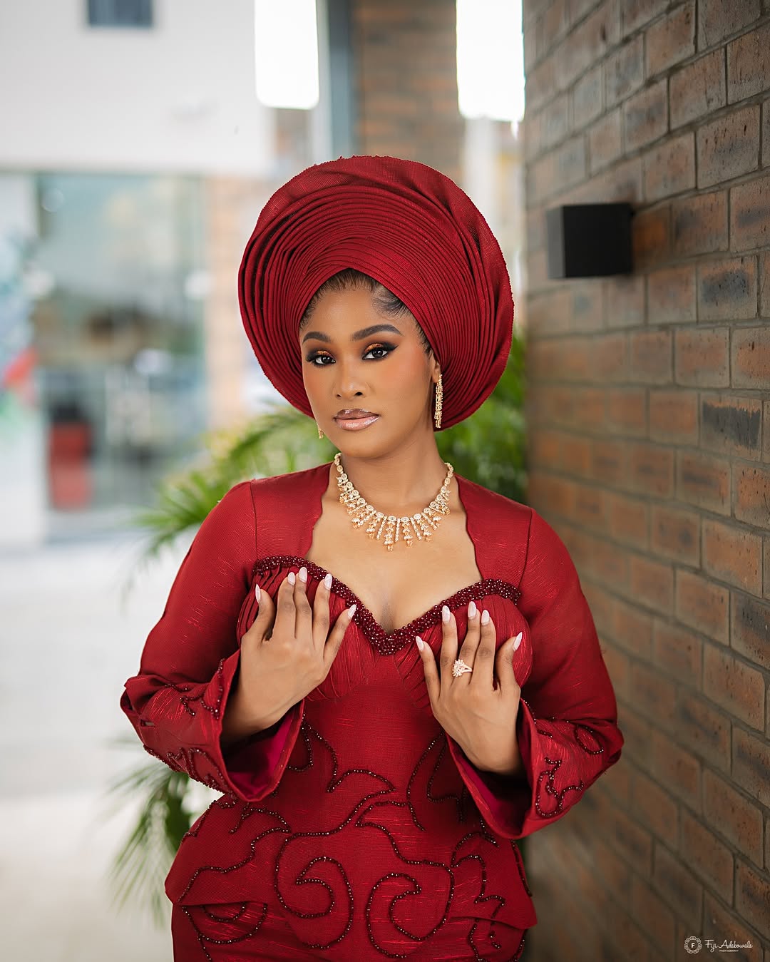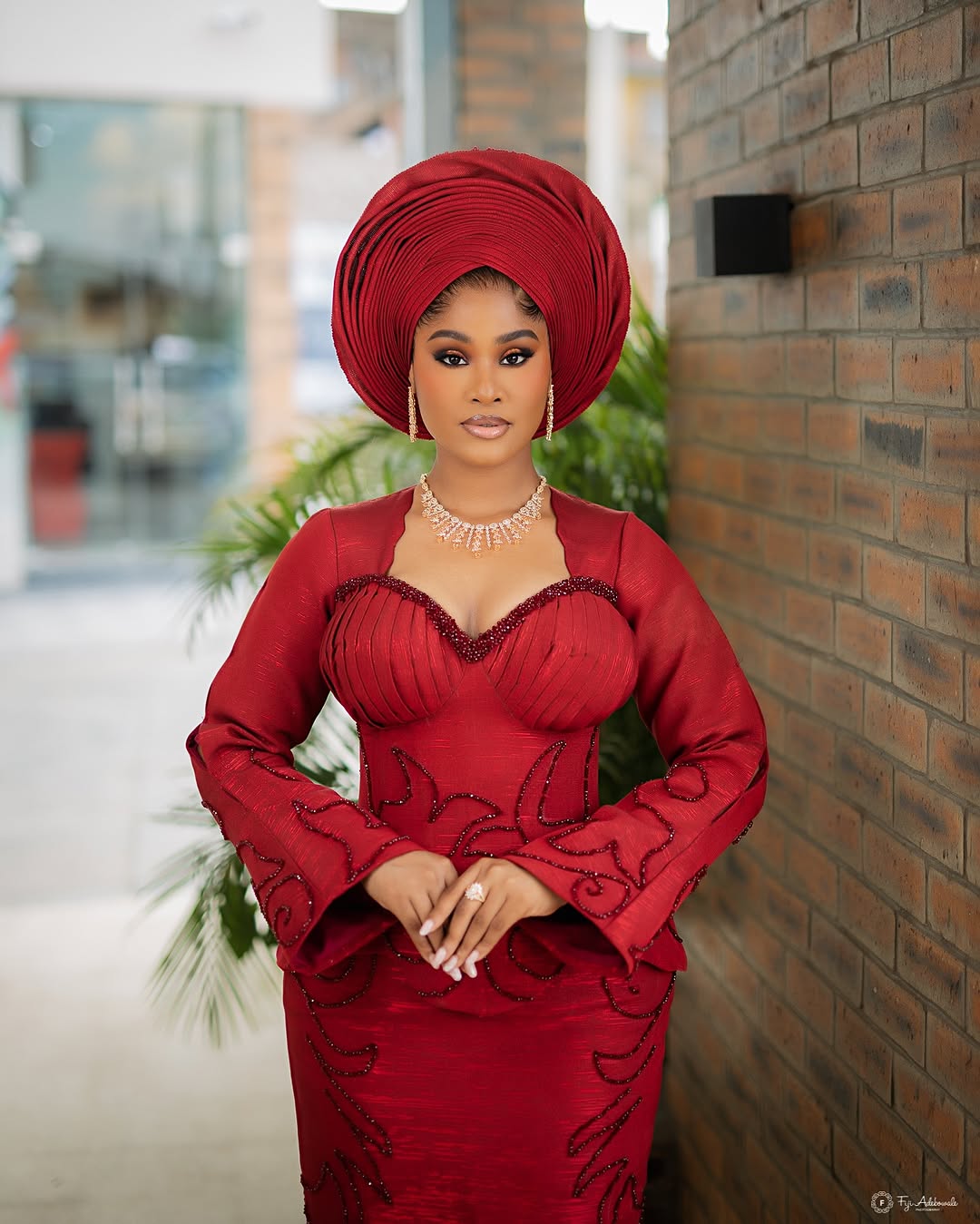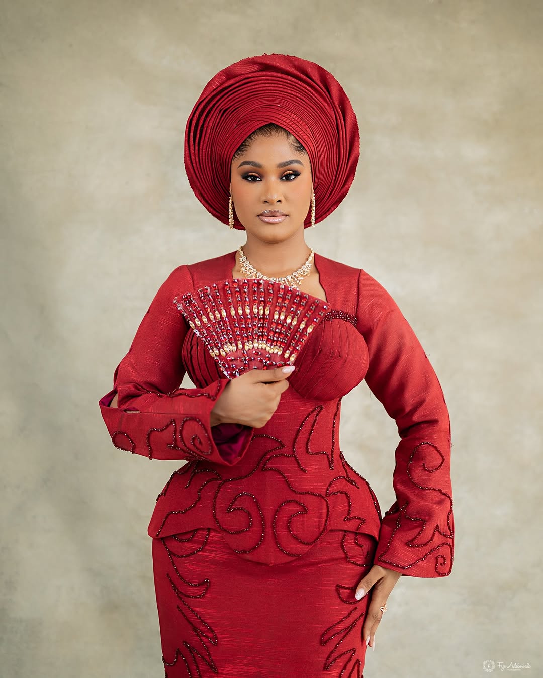 1106 Bridal designed this gorgeous red aso-oke bridal look, and it’s completely spectacular. From the beaded sweetheart neckline to the cutout patterns on the sleeves, the pleated bust and the swirly beadings all over the silhouette, this look is a perfect ten. A Yoruba bride absolutely needs her gele, and T Best Gele did not disappoint, crafting a perfectly upright gele with a regal touch. Beauty by OJZ then snapped with this glowy makeup, featuring smoky eyes and a glamorous finish. If you ask us, this ensemble is guaranteed to turn your wedding moments into a high-end fashion show. This is your cue to let this look help you bring out that stylish omóge in you.